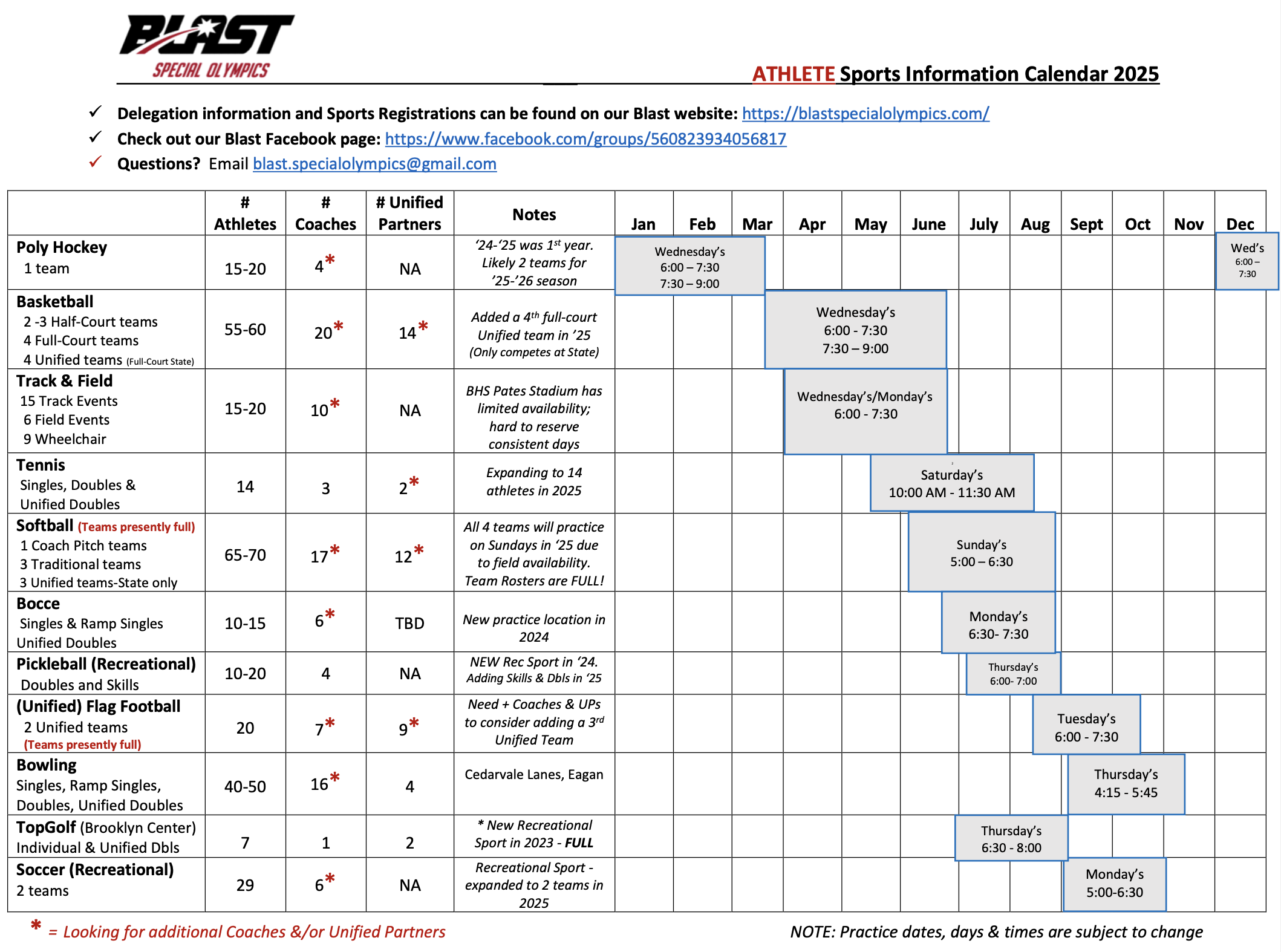 The Blast currently offers 11 different sports throughout the year for athletes of varying skill levels. In addition to traditional Special Olympics competitions, the Blast also participates in Unified sports where Unified Partners compete alongside Special Olympics athletes. Please refer to the diagram below or the individual sports pages for more details on each sport’s season